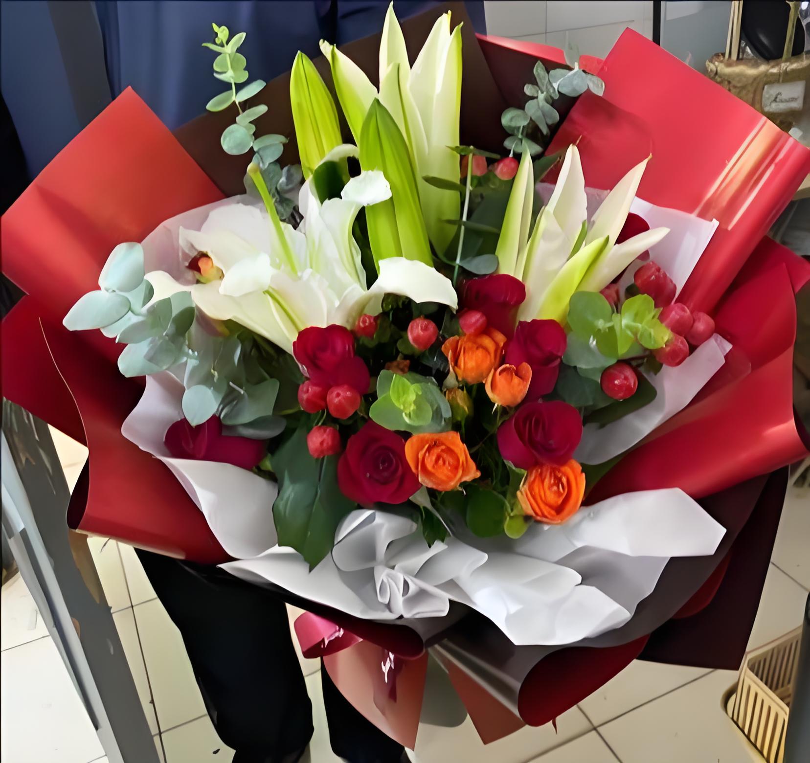 德州德城区花店包11枝红玫瑰、2枝多头白百合、6枝橙色多头玫瑰、红豆、尤加利叶